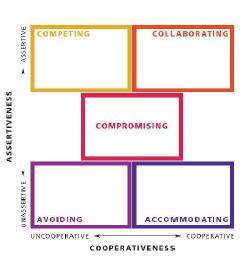 The Thomas-Kilmann Conflict Mode Instrument (TKI) is an example of an assessment that gauges an individual’s behavior in conflict situations. By evaluating a person’s behavior along two grids (1) assertiveness -- the extent to which the individual attempts to satisfy his or her own concerns, and (2) cooperativeness -- the extent to which the individual attempts to satisfy the concerns of others -- the TKI contributes to a broader personal understanding and resolution of conflict. These two dimensions, assertiveness and cooperativeness, can be used to define the five modes of handling conflict, as shown in the diagram above.
